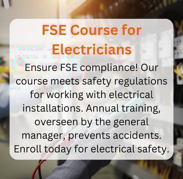 Ensure FSE compliance! Our course meets safety regulations for working with electrical installations. Annual training, overseen by the general manager, prevents accidents. Enroll today for electrical safety.