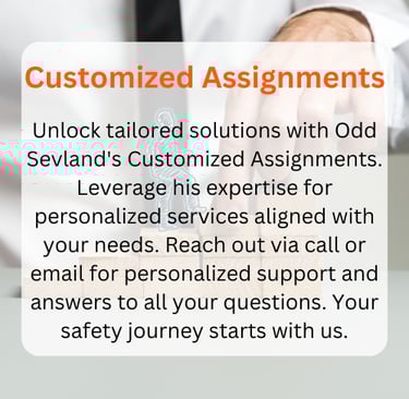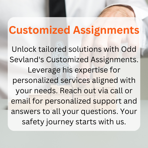 Unlock tailored solutions with Odd Sevland's Customized Assignments. Leverage his expertise for personalized services aligned with your needs. Reach out via call or email for personalized support and answers to all your questions. Your safety journey starts with us.
