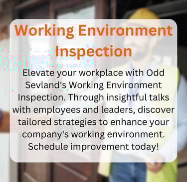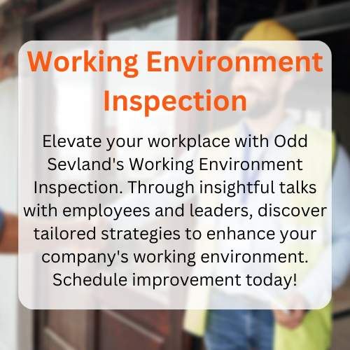Elevate your workplace with Odd Sevland's Working Environment Inspection. Through insightful talks with employees and leaders, discover tailored strategies to enhance your company's working environment. Schedule improvement today!
