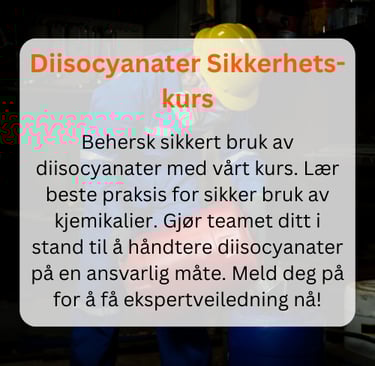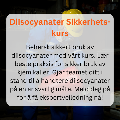Behersk sikkert bruk av diisocyanater med vårt kurs. Lær beste praksis for sikker bruk av kjemikalier. Gjør teamet ditt i stand til å håndtere diisocyanater på en ansvarlig måte. Meld deg på for å få ekspertveiledning nå!