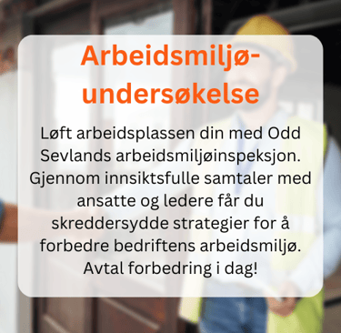 Løft arbeidsplassen din med Odd Sevlands arbeidsmiljøinspeksjon. Gjennom innsiktsfulle samtaler med ansatte og ledere får du skreddersydde strategier for å forbedre bedriftens arbeidsmiljø. Avtal forbedring i dag!