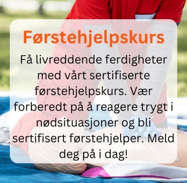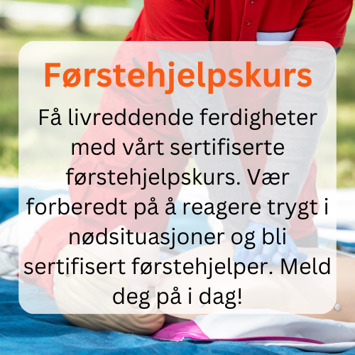 Få livreddende ferdigheter med vårt sertifiserte førstehjelpskurs. Vær forberedt på å reagere trygt i nødsituasjoner og bli sertifisert førstehjelper. Meld deg på i dag!