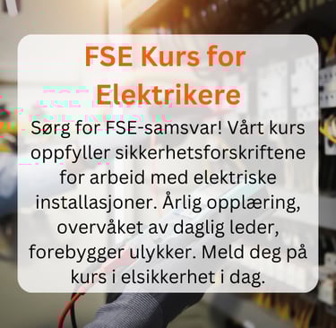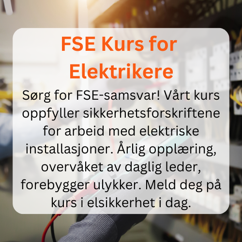 Sørg for FSE-samsvar! Vårt kurs oppfyller sikkerhetsforskriftene for arbeid med elektriske installasjoner. Årlig opplæring, overvåket av daglig leder, forebygger ulykker. Meld deg på kurs i elsikkerhet i dag.