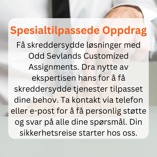 Få skreddersydde løsninger med Odd Sevlands Customized Assignments. Dra nytte av ekspertisen hans for å få skreddersydde tjenester tilpasset dine behov. Ta kontakt via telefon eller e-post for å få personlig støtte og svar på alle dine spørsmål. Din sikkerhetsreise starter hos oss.